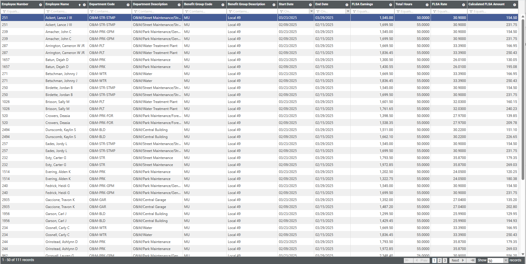 After making your selections, click Print to generate and display an exportable grid of the data, with the far-right column containing the calculated FLSA amounts: