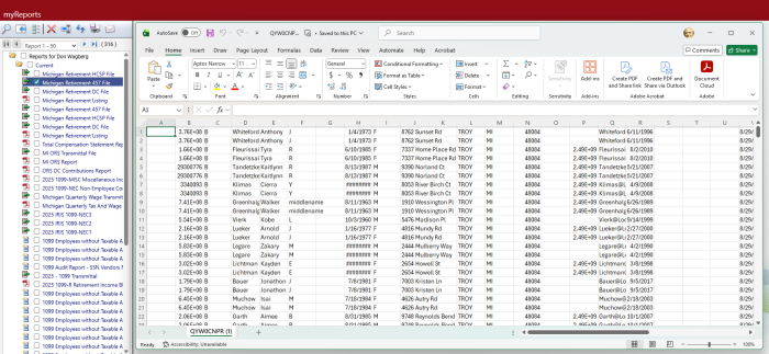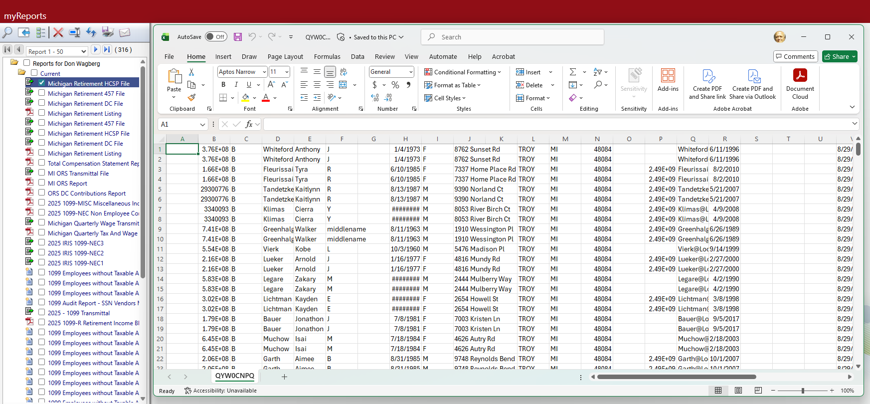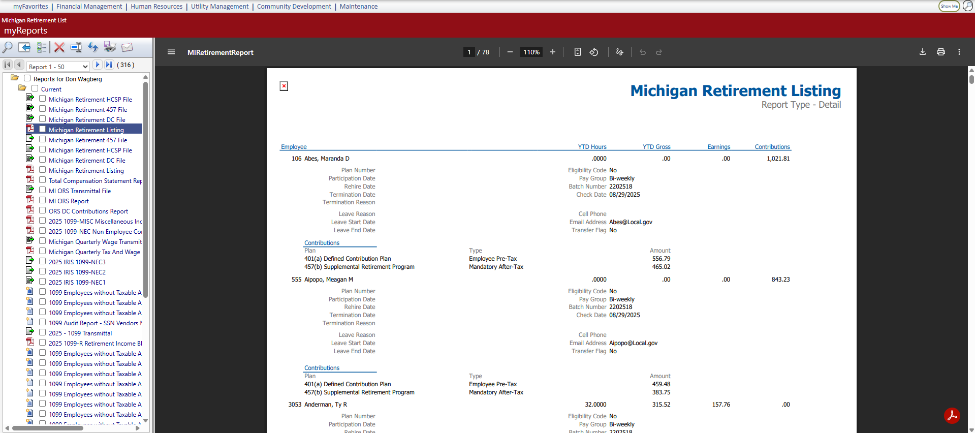 After making your selections, click Ok. (If retirement data has been created previously, a dialog asks whether you want to overwrite the data.) Retirement data matching the selections populates the grid on the Michigan Retirement List page: