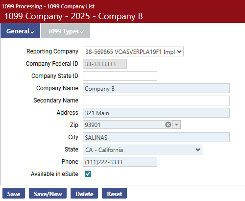 To edit company information before 1099s are created, click the corresponding Company Federal Tax ID hyperlink. To add a new company for this tax year, click the New button. In either instance, the 1099 Company page opens, with the General tab displayed as the default: