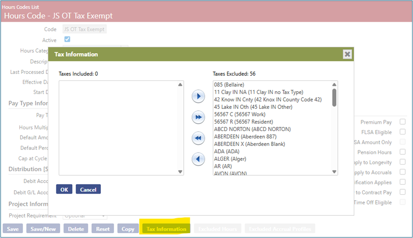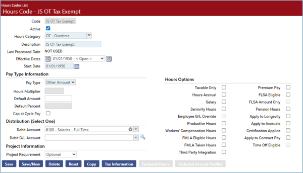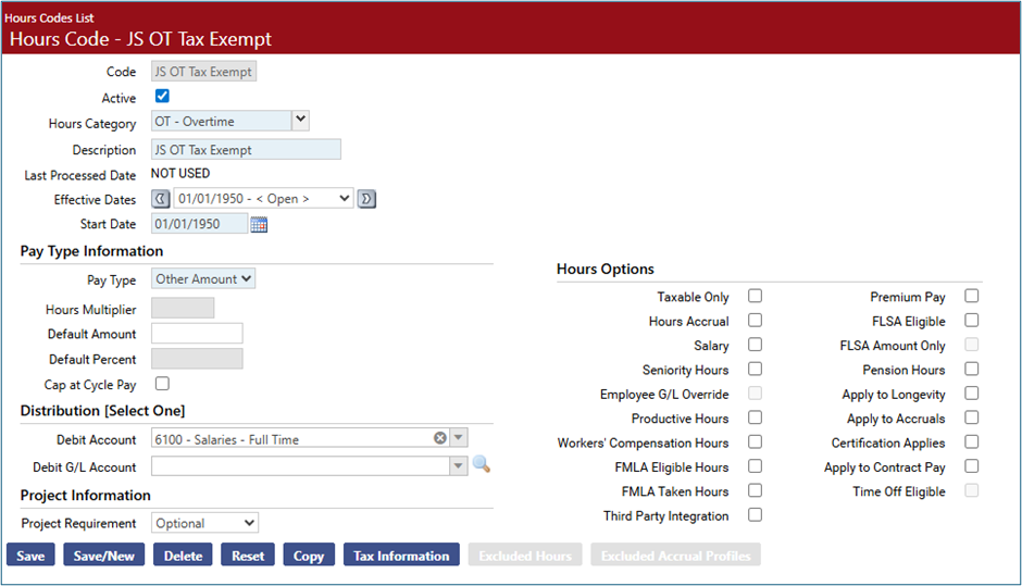 Build a new hours code that can be used to report on the qualified overtime amount for employees. Below is an hours code that is configured with a pay type of Other Amount and has Tax Information selected with all taxes excluded (similar setup to a reimbursement type hours code):