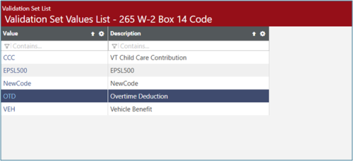Go to Maintenance > new world ERP suite > System > Validation Sets > Validation set list. Find Validation Set 265 – W-2 Box 14 Code. Add a new code for box 14. The example below shows a code of OTD and a description of Overtime Deduction: