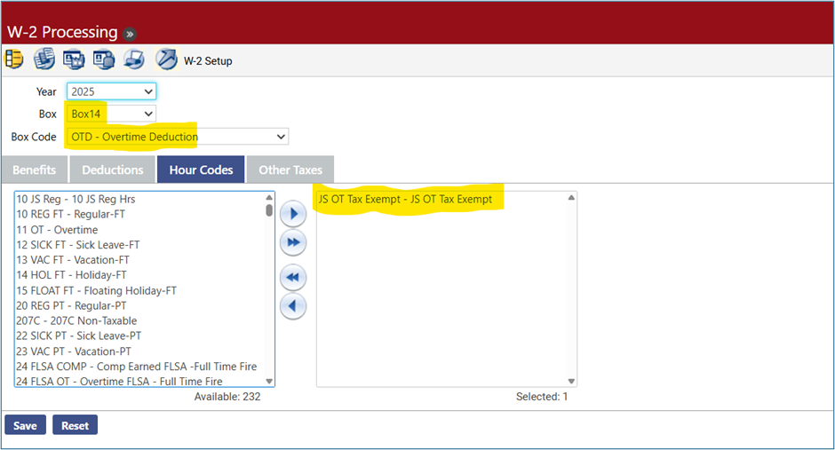 Go to Human Resources > Year-End Processing > W-2 Processing. This is the W-2 Setup page. Select Box14 from the Box drop down menu. From the Box Code drop down, select the newly created code for qualified overtime (this example uses OTD-Overtime Deduction) Next, select the Hours Code tab to activate the available hours codes for selection and move the newly created hours code for qualified overtime into the jump box on the right. This example shows the hours code of JS OT Tax Exempt, built earlier: