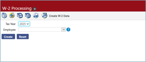 Within the Year End Processing menu, navigate to the next workflow icon, Create W-2 Data. Select the tax year and click the Create button to generate the W-2 data: