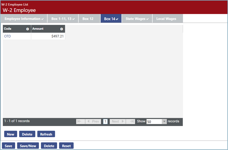 The W-2 Employee workflow icon will display the employee list of W-2s created. Click one of these employees and select the Box 14 tab to display the results of the qualified overtime that was imported via Adjustment Processing and mapped to Box 14 of the W-2 during the create W-2 process: