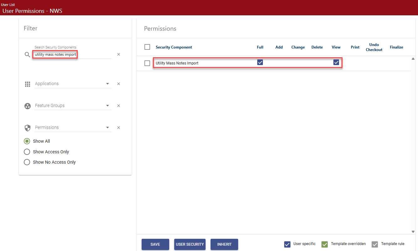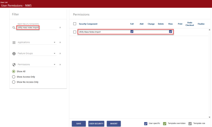 In the Search Security Components filter, type utility mass notes import. The grid refreshes to display the Utility Mass Notes Import component: