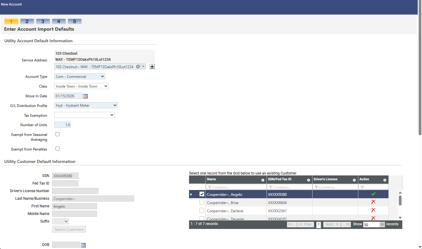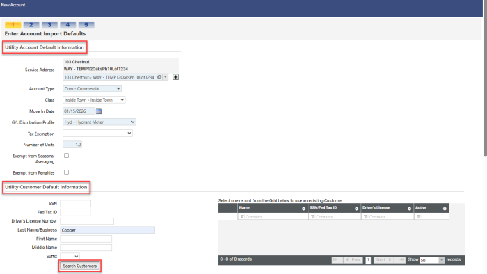 In step 1, enter the utility account defaults and customer defaults: