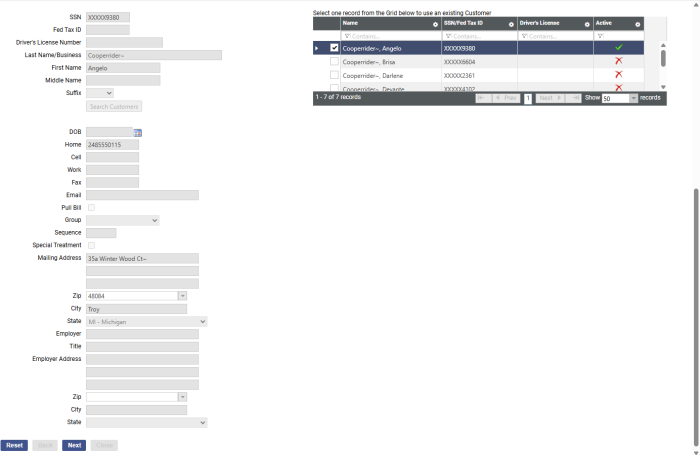 If you are not entering information for a new customer but want to tie an existing customer to a new account, enter the Last Name/Business of the existing customer and any other known information, and click the Select Customers button. The grid on the right loads with the closest customer matches: