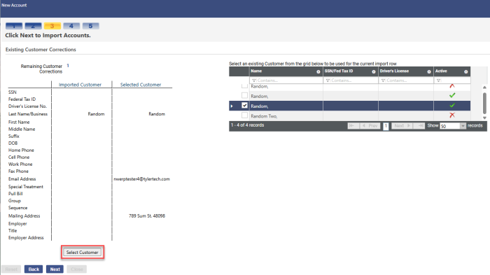 The import file includes a field named, Use Existing Customer; if the field is set to TRUE for any account in the import file, the account displays in the grid. Mark one you want to use, and click the Select Customer button. The customer's information fills the Selected Customer column: