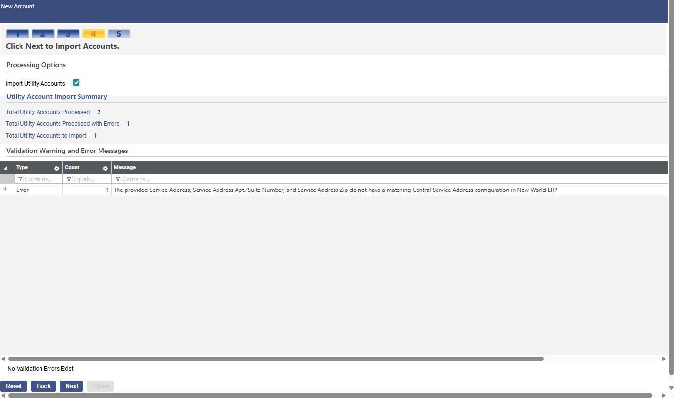 Click Next to go to step 4. This step displays the number of accounts processed, the number processed with errors, the number that will be imported and a grid containing the validation warnings and errors: