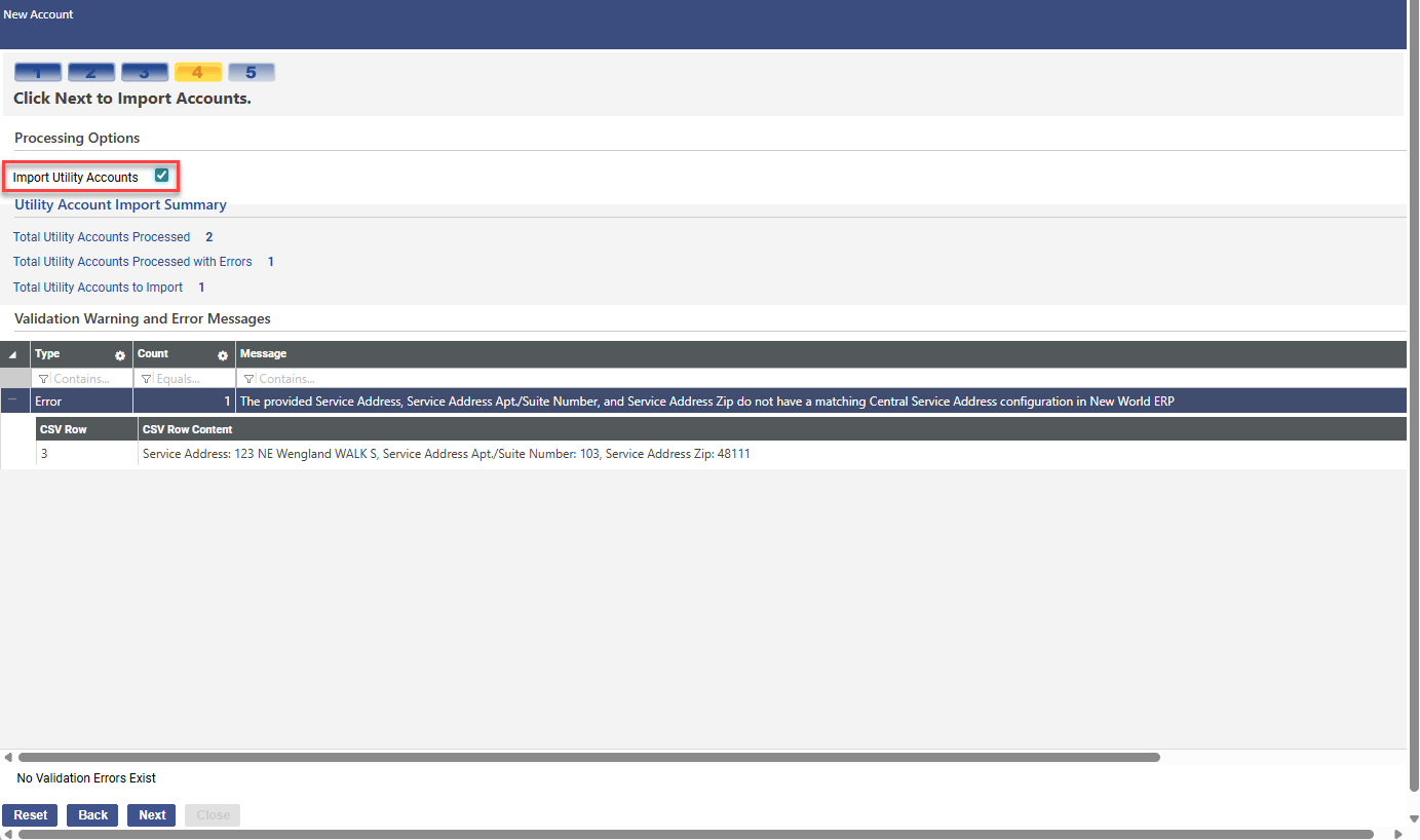 To run the import, mark the Import Utility Accounts checkbox in step 4, and click Next.