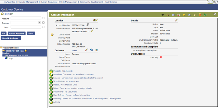 Click Close. The Customer Service page displays with the imported account(s) in the search results panel:
